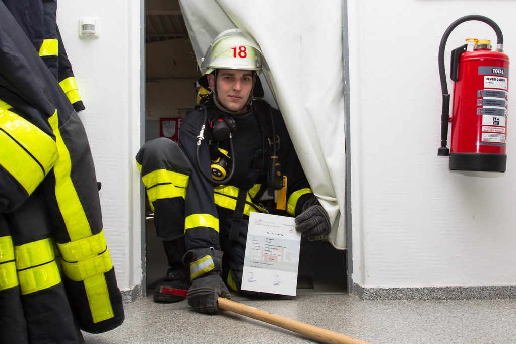Abgeschlossen wurde der Lehrgang mit der theoretischen Prüfung am vergangenen Freitag und der praktischen Prüfung am gestrigen Samstag. In der praktischen Prüfung wurde ein Brand im 2. OG vorgegeben. Die Trupps mussten über eine Steckleiter und das Treppenhaus in die Wohnung eindringen und eine dort gefundene bewusstlose Person aus dem Gefahrenbereich retten. Danach wurde der Löscheinsatz fortgeführt und das angenommene Feuer gelöscht.