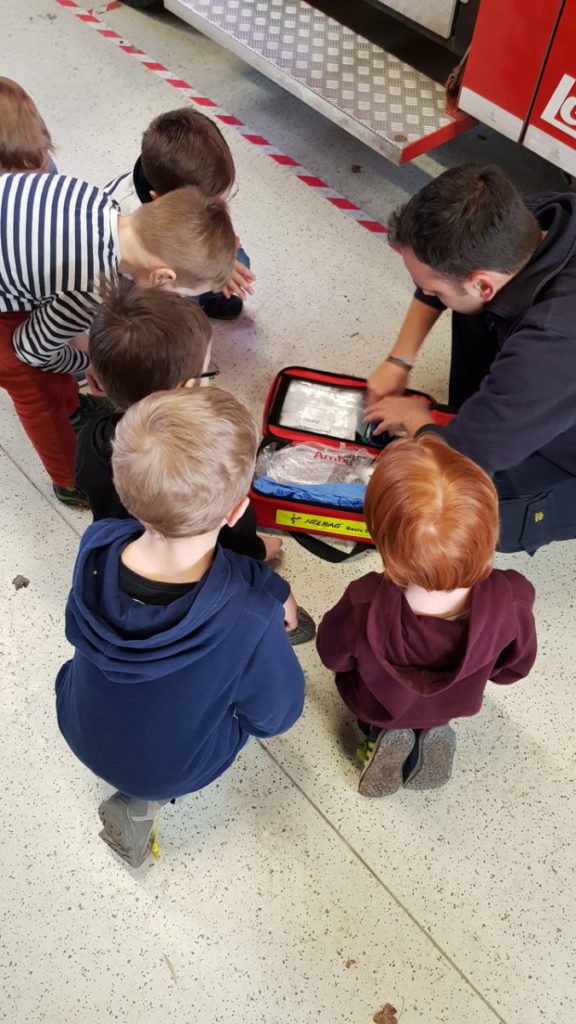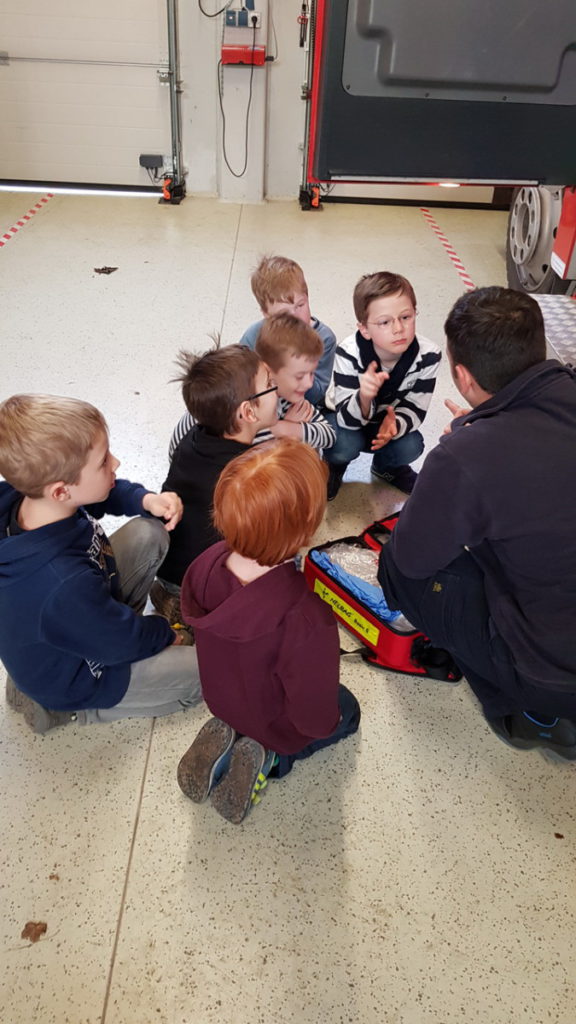 Bei der Minifeuerwehr war ein Besuch unserer Fahrzeughalle angesagt. Selbstredend üben die großen roten Autos mit den Blaulichtern einen großen Reiz auf die Kleinen aus. Unser Wehrführer, Bernhard Hahn, zeigte dem Mini-Nachwuchs unsere Fahrzeuge und brachte damit die Kinderaugen zum Leuchten. Danach wurde das eben Gelernte mit einer Runde „Ich packe mein Feuerwehrauto und nehme mit…“ vertieft.