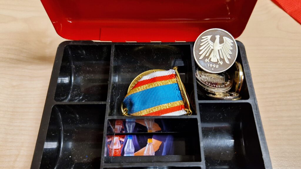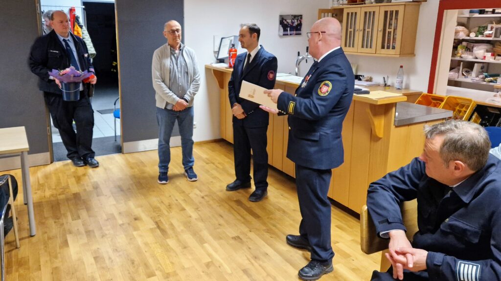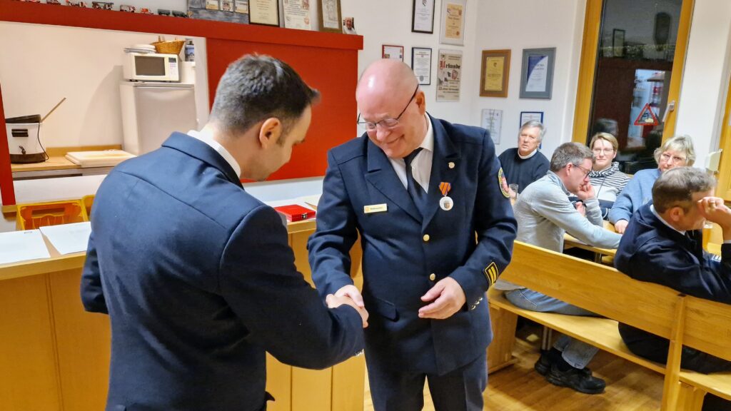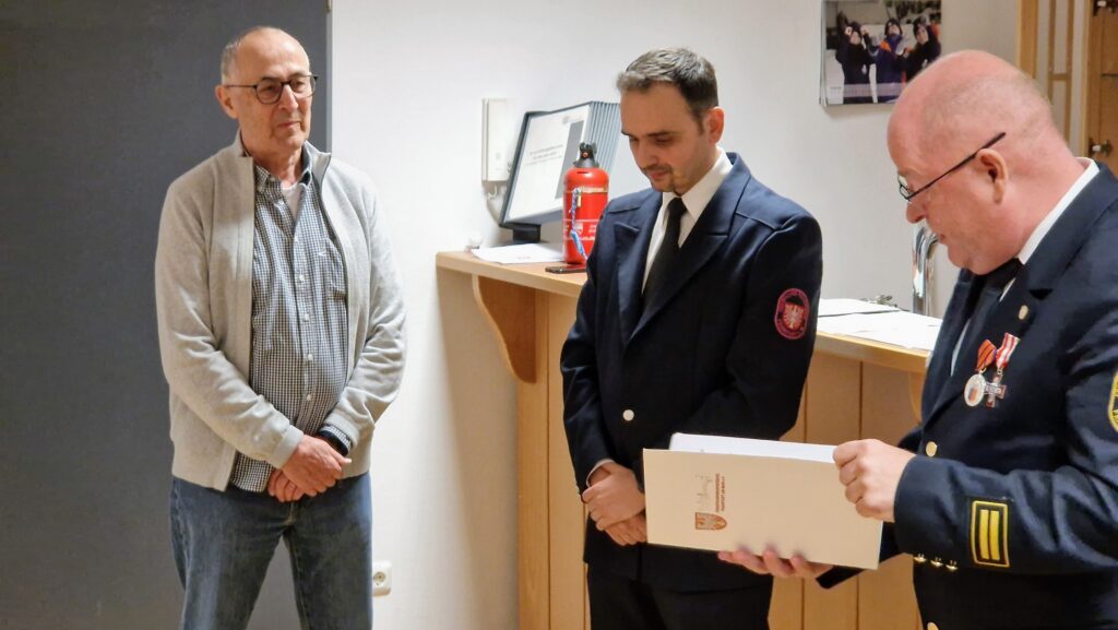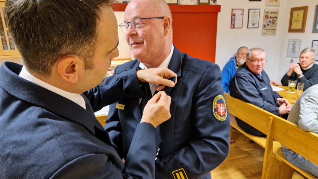Zum Abschluss der Veranstaltung ehrte Hahn Theo Lenz für seine 20-jährige Tätigkeit mit der „Ehrenauszeichnung in Gold am Bande“ des Kreisfeuerwehrverbandes Frankfurt (KFV). Als Zeichen der Anerkennung und zur Erinnerung erhielt Lenz eine gravierte Kasse, gefüllt mit D-Mark Münzen aus dem Jahr 1998 – dem Jahr, in dem er seine Arbeit als Kassenwart aufnahm.