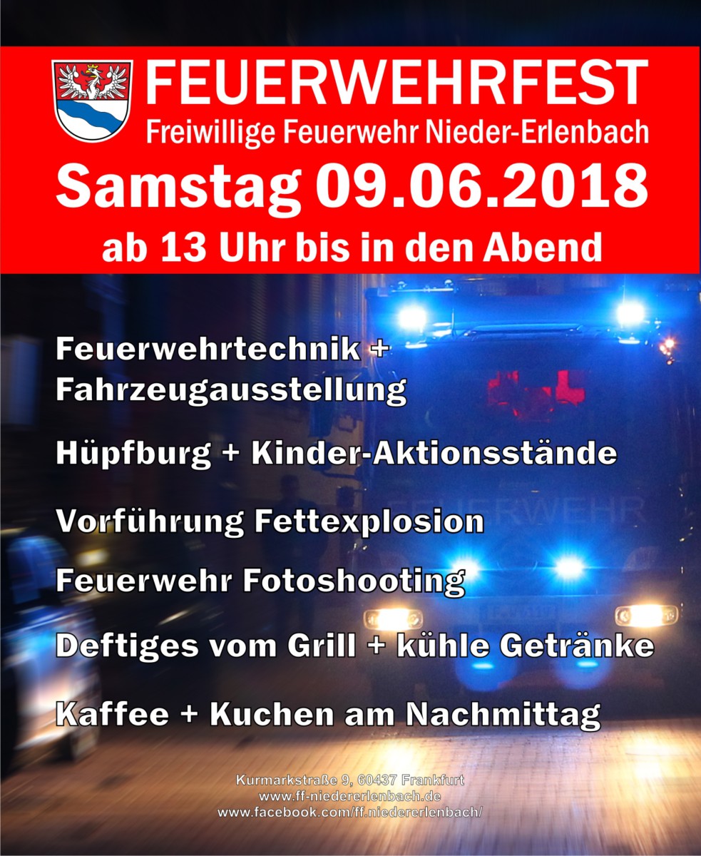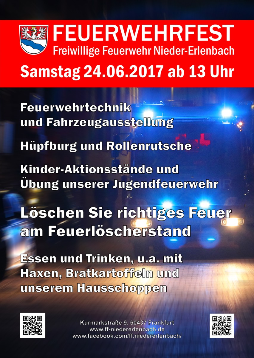 Am kommenden Samstag, 24.06.2017, laden wir ab 13 Uhr herzlich ein zu unserem Feuerwehrfest im Feuerwehrhaus der Freiwilligen Feuerwehr Nieder-Erlenbach in der Kurmarkstraße 9!...
