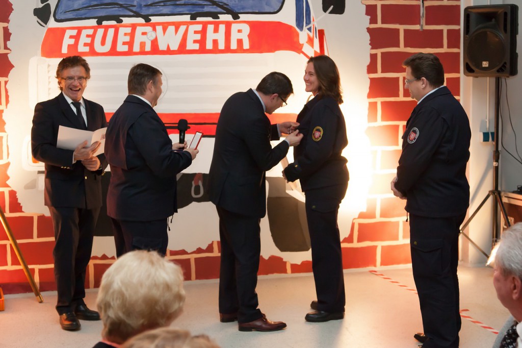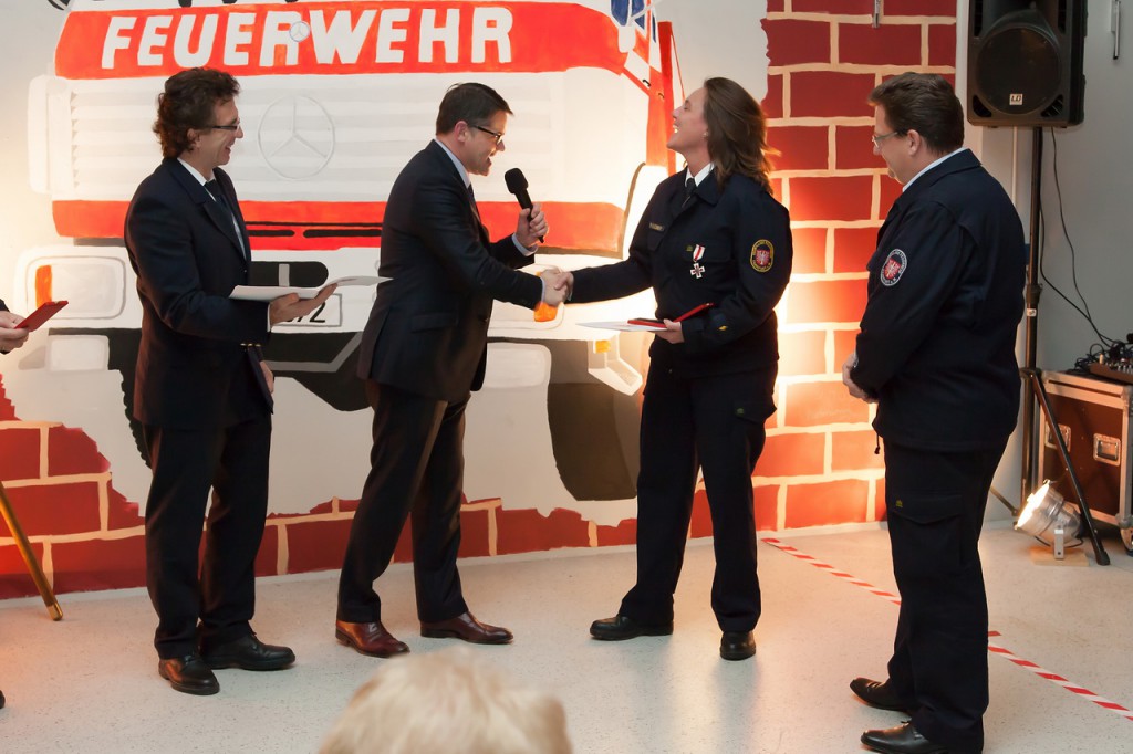 Melinda Fleckner und Stefan Ziegler von der Freiwilligen Feuerwehr Rödelheim wurden beide für ihr außerordentliches Engagement, nicht nur, aber auch im Bereich der Jugendfeuerwehr in Frankfurt, mit dem Silbernen Brandschutzehrenzeichen geehrt. Voraussetzungen für die Verleihung des Silbernen Brandschutzehrenzeichens sind eine mindestens 25-jährige Dienstzeit in einer Freiwilligen Feuerwehr und eine sich über den ganzen Zeitraum erstreckende, aktive und pflichttreue Dienstzeit oder der Erwerb besonderer Verdienste um den Brandschutz. Beide Geehrten bekamen die Auszeichnung von Innenminister Rhein persönlich überreicht.
