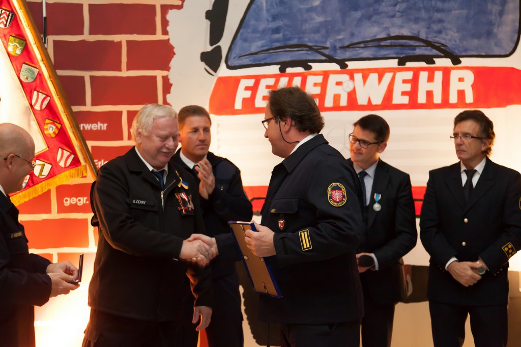 Aus Nieder-Erlenbacher Sicht besonders erfreulich war die anschließende Ehrung des ehemaligen Nieder-Erlenbacher Wehrführers Gerd Cerny, der unter anderem für das Einrichten einer Station im Mutter-Kind Krankenhaus in Kiew mit einer Auszeichnung für den Verdienst über Landesgrenzen hinaus geehrt wurde. Gerd Cerny berichtete anschließend von seiner kürzlichen Reise nach Tscherkassy, wo er an den Feierlichkeiten zum 40-jährigen Bestehen der Feuerwehr-Akademie teilnahm.