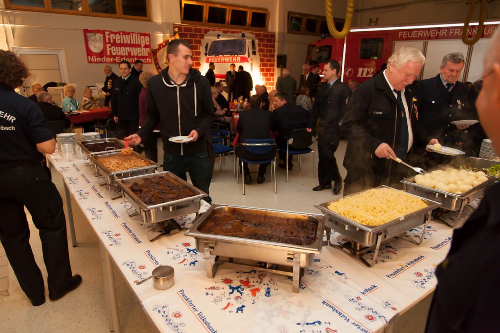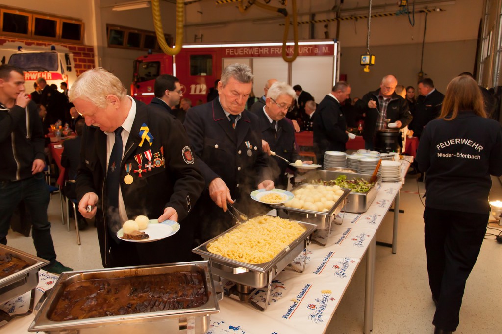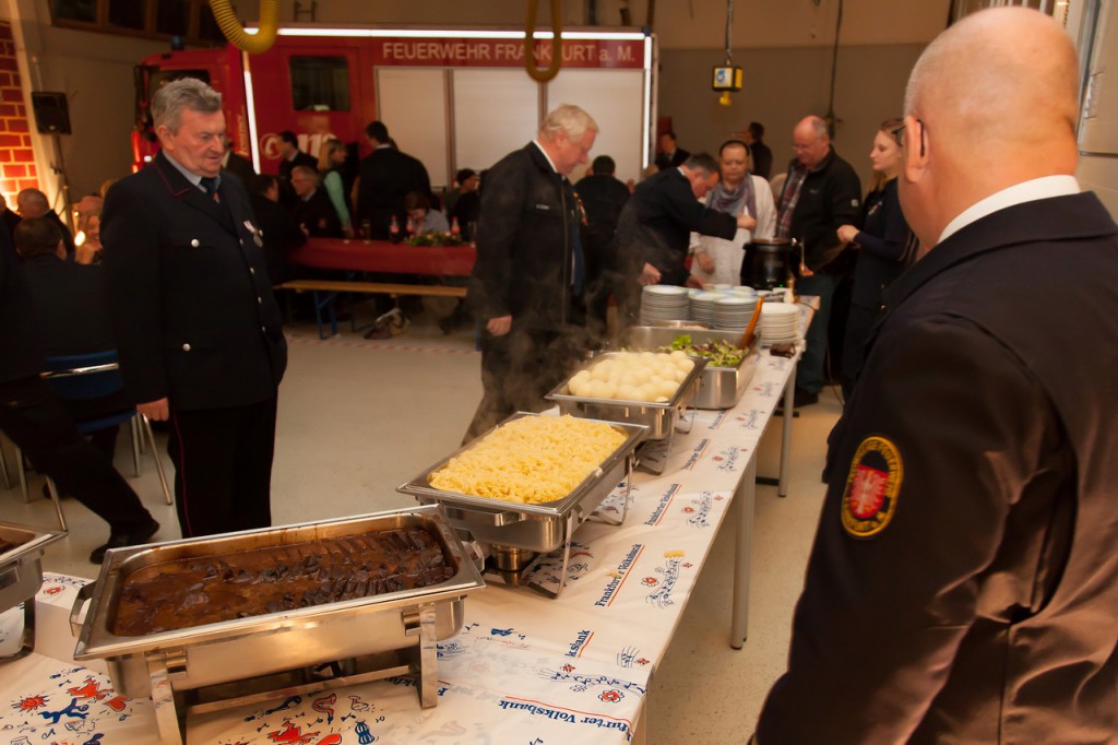 Nachdem alle weiteren Ehrungen für vieljähriges Engagement in der Freiwilligen Feuerwehr Frankfurt abgeschlossen waren, konnten sich die Geehrten und ihre Begleitungen am Buffet stärken, auf dem in diesem Jahr Tomaten-Consommé mit Croutons, frischer Salat, Burgunderbraten mit Soße, Geflügelgeschnetzeltes, Knödel und Nudeln angeboten wurde. Eine Quarkspeise mit Früchten stand zur Abrundung als Dessert bereit. Dirk Rübesamen, der federführende Chefkoch, heimste für seine Kreationen von diversen Seiten großes Lob ein.