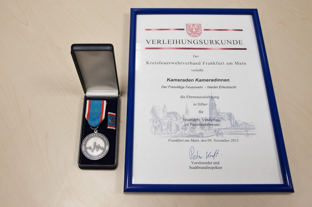 Eine weitere für uns sehr erfreuliche Ehrung betraf die Freiwillige Feuerwehr Nieder-Erlenbach an sich. Diese durfte, vertreten durch den stellvertretenden Wehrführer Alexander Zaharanski, die Ehrenauszeichnung in Silber für besondere Verdienste im Feuerwehrwesen von Stadtbrandinspektor Peter Kraft entgegennehmen, auch als Dankeschön für die Ausrichtung der vergangenen Ehrungsveranstaltungen.