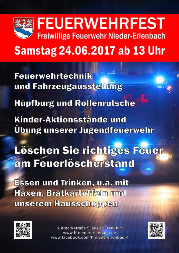 Am kommenden Samstag, 24.06.2017, laden wir ab 13 Uhr herzlich ein zu unserem Feuerwehrfest im Feuerwehrhaus der Freiwilligen Feuerwehr Nieder-Erlenbach in der Kurmarkstraße 9!