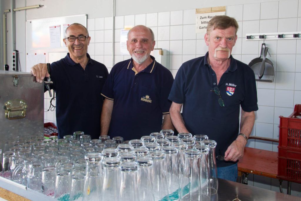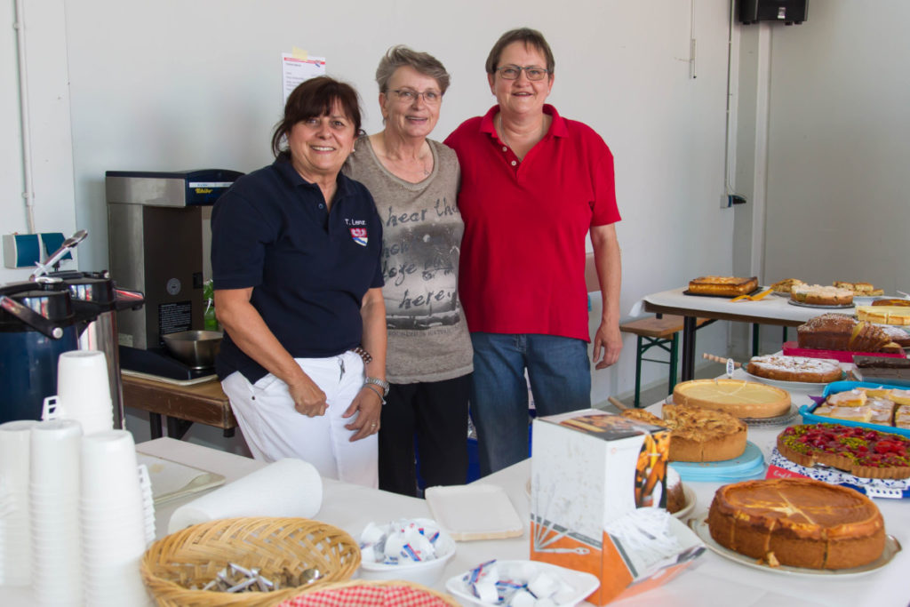 Aufgrund der hochsommerlichen Temperaturen war die Getränketheke eine beliebte Anlaufstelle. Zusammen mit einem Imbiß vom Grill und als Dessert einem Stück von den zahlreichen angebotenen Kuchen ließ es sich im Schatten der Halle hervorragend aushalten.
