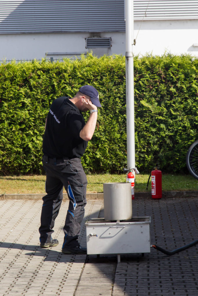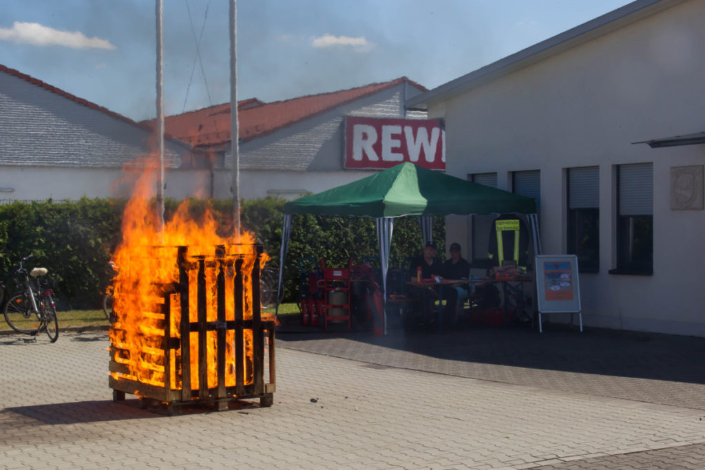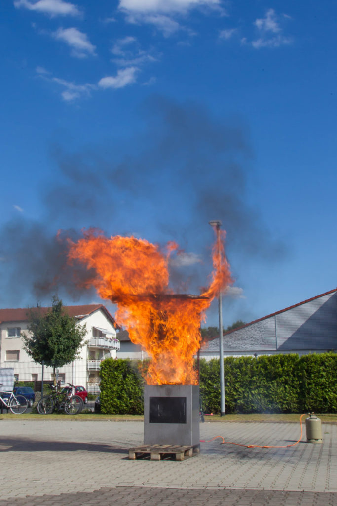 Ein weiteres Highlight war die Demonstration einer Fettexplosion. Die Größe des Feuerballs rief angesichts der kleinen dafür verwendeten Mengen von Öl und Wasser großes Erstaunen hervor. Anschließend zeigte der dumpfe Knall einer Explosion aus dem Feuerbecher vom Crash-Instructor-Team an, was passiert, wenn eine Sprühdose hohen Temperaturen, wie sie zum Beispiel im Sommer auch in Fahrzeugen auftreten können, ausgesetzt wird.