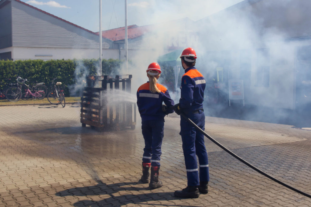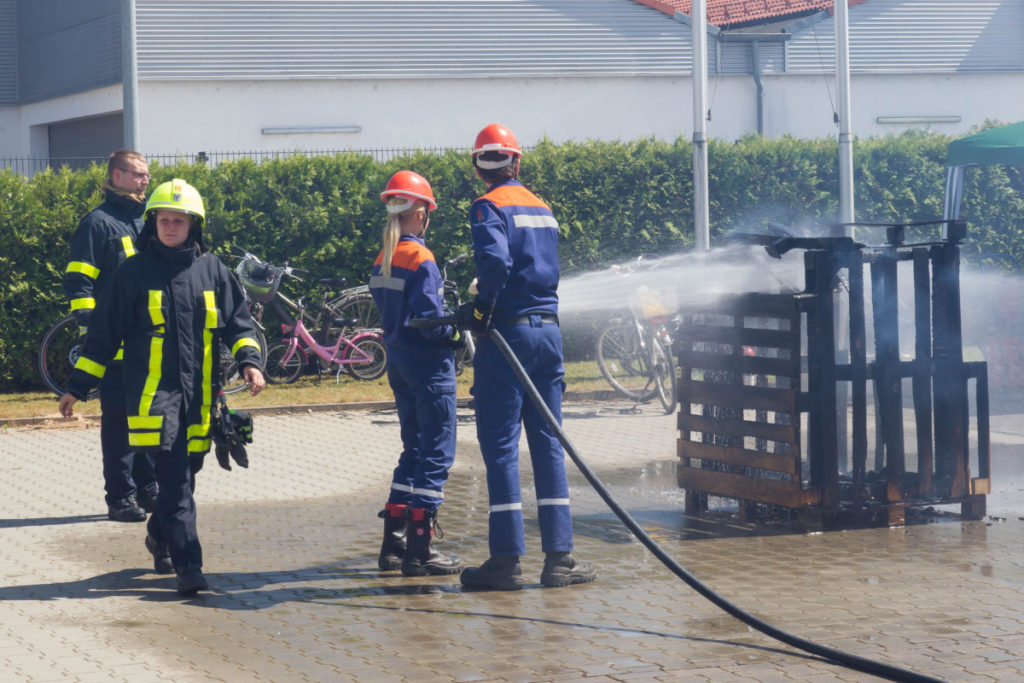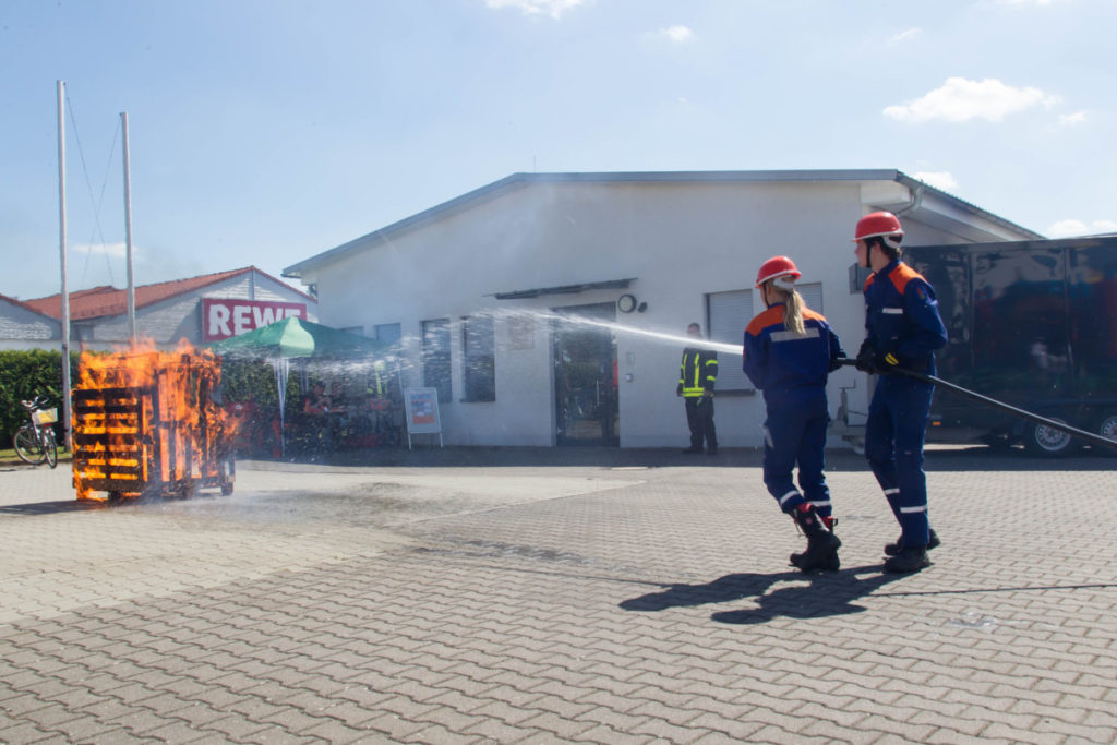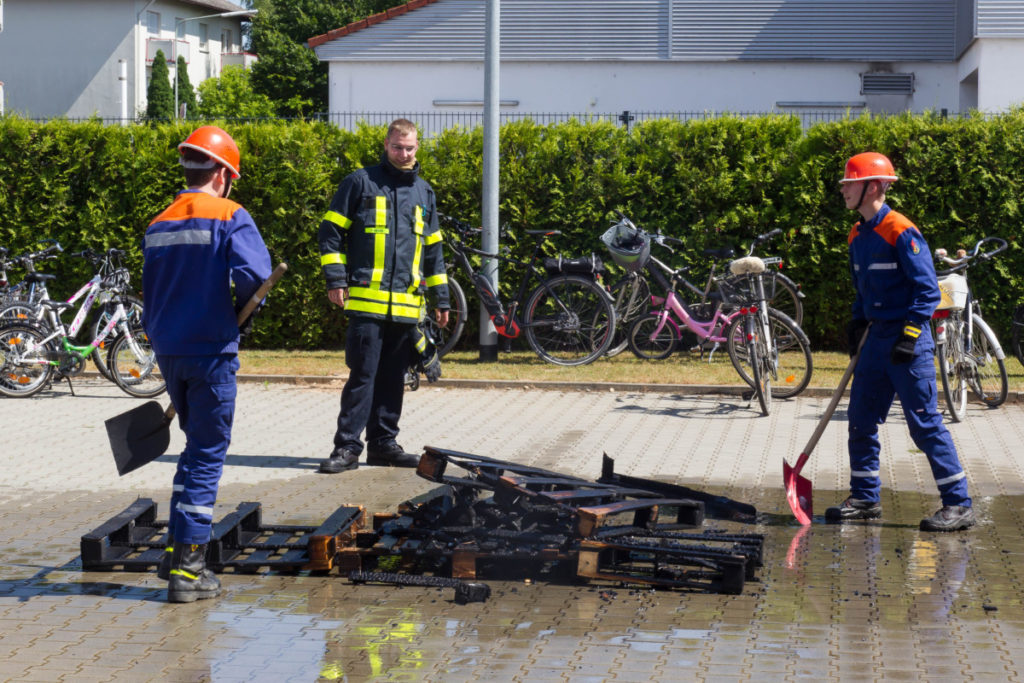 Am späteren Nachmittag zeigte unsere Jugendfeuerwehr ihr Können: Brennende Holzpaletten wurden vom Angriffstrupp mit dem Schnellangriff gelöscht, während der Wassertrupp eine Wasserversorgung vom Hydranten aufbaute. Nachdem das Feuer geköscht war, wurden die verkohlten Überreste des Brandes auseinandergezogen und kontrolliert.