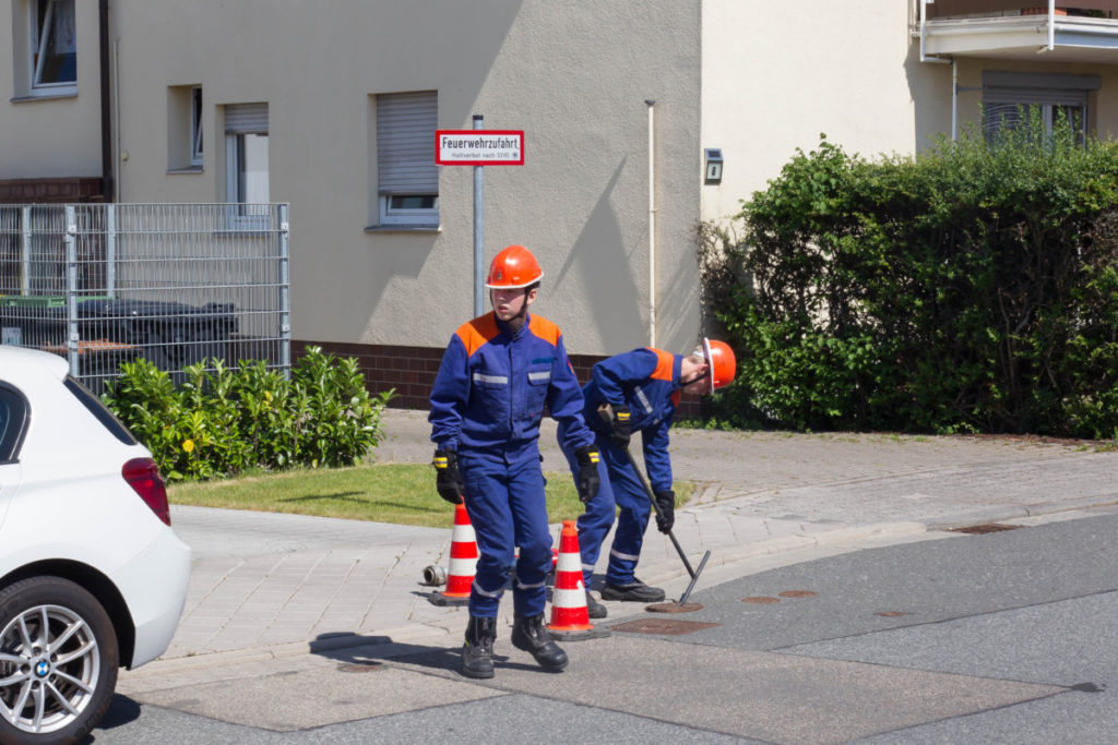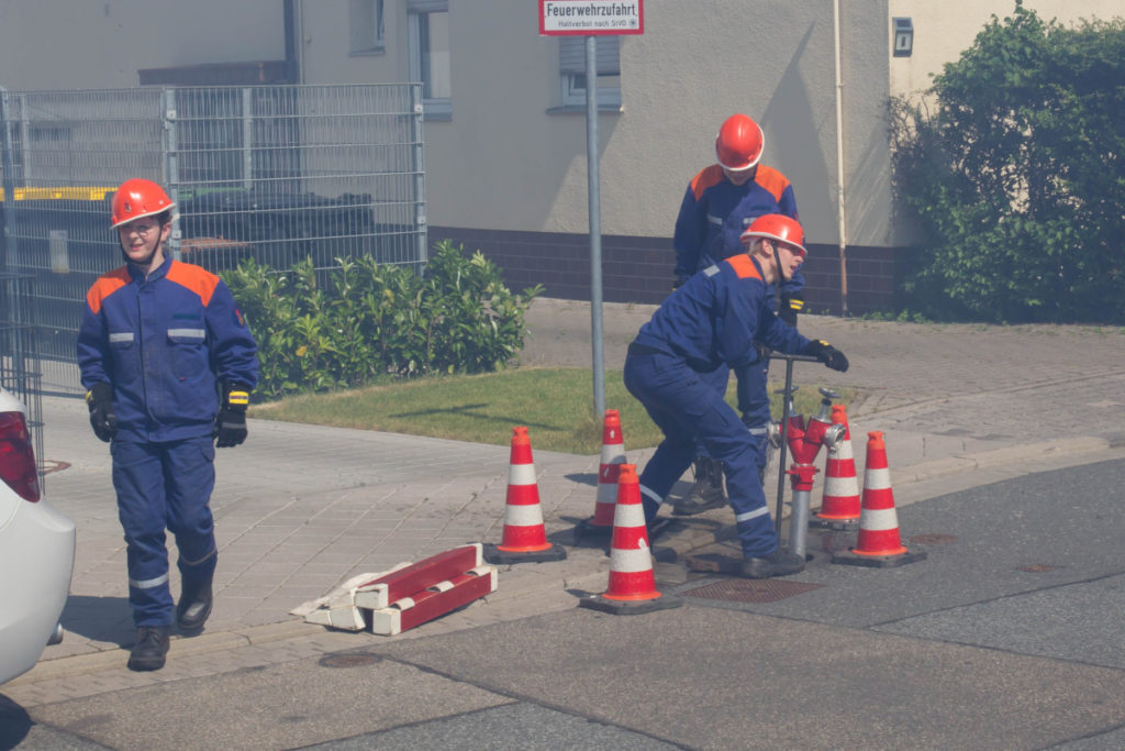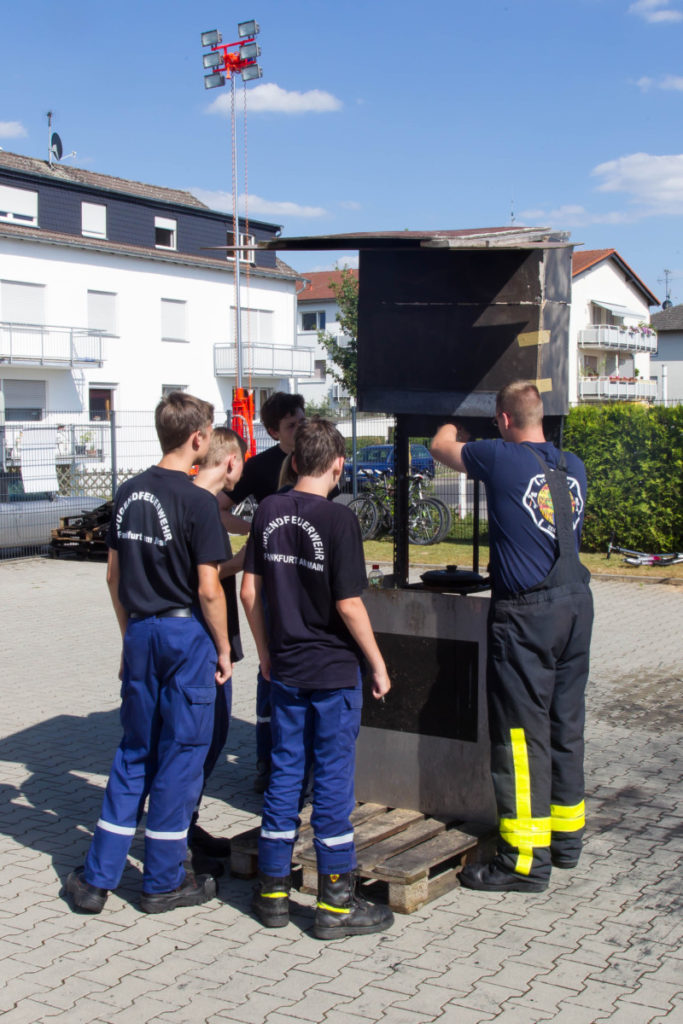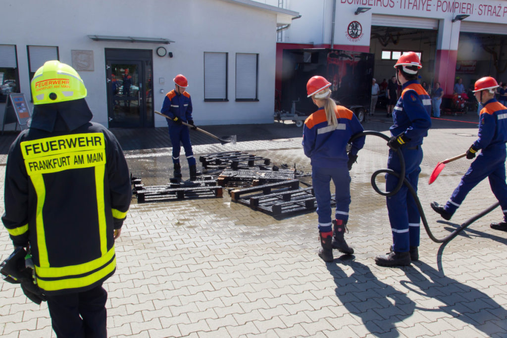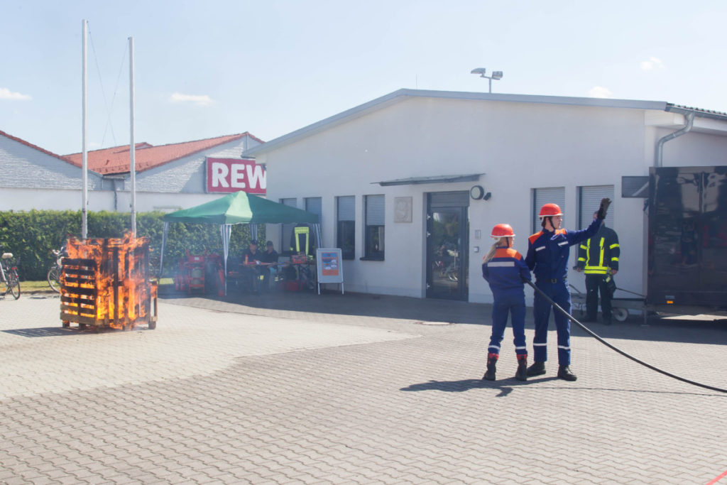 Am späteren Nachmittag zeigte unsere Jugendfeuerwehr ihr Können: Brennende Holzpaletten wurden vom Angriffstrupp mit dem Schnellangriff gelöscht, während der Wassertrupp eine Wasserversorgung vom Hydranten aufbaute. Nachdem das Feuer geköscht war, wurden die verkohlten Überreste des Brandes auseinandergezogen und kontrolliert.