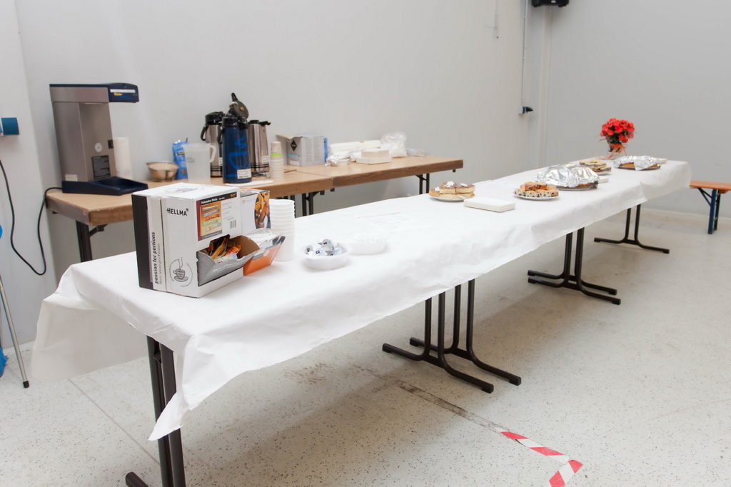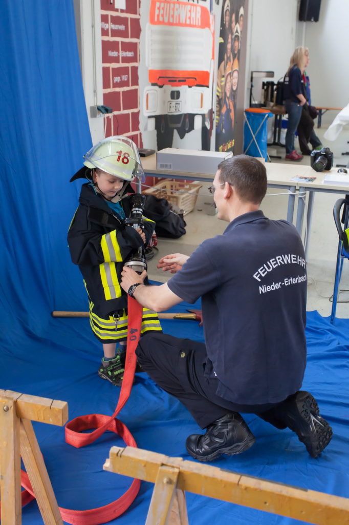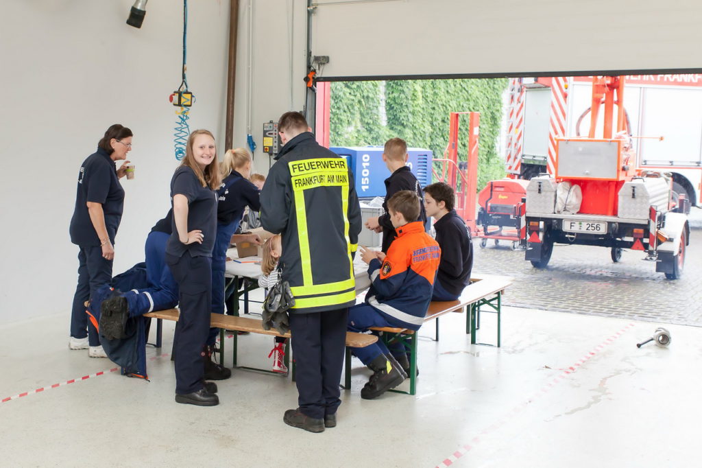 Aufgrund der unsicheren Wetterprognose für die folgenden Stunden mussten wir dann leider den Feuerlöscherstand und die Hüpfburg für Kinder absagen. Zwischen 11 Uhr und 12 Uhr klarte sich der Himmel dann langsam auf und ließ sogar einige Sonnenstrahlen hindurchblitzen. Als dann die Sonne eine stetig größer werdende Schar von Besuchern angelockt hatte, kündigte sich die nächste Herausforderung an: Um Punkt 11:57 Uhr alarmierte uns die Leitstelle Frankfurt. In Enkheim hatte der Starkregen noch bei weitem stärker gewütet als bei uns, eine Vielzahl an Notrufen war die Folge.