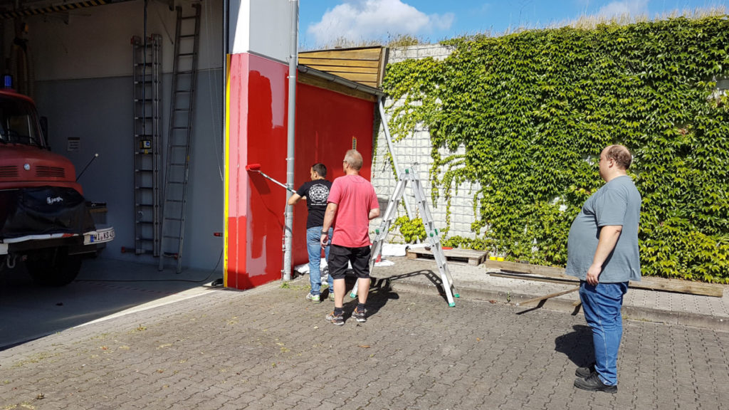 An der besonders exponierten Rückseite des Feuerwehrhauses war aus dem ursprünglichen Feuerwehrrot ein Farbton geworden, den man (laut aktueller Internetrecherche des Autors) irgendwo zwischen „Erdbeerrot“ und „Altrosa“ verorten musste. Den jeden Monat am dritten Samstag stattfindenden Haustag nutzten wir gestern deswegen dazu, die rot gestrichenen Wände wieder in ihrem ursprünglichen Feuerwehrrot erstrahlen zu lassen. Die Fotos zeigen eindrucksvoll den Erfolg der Maßnahme.