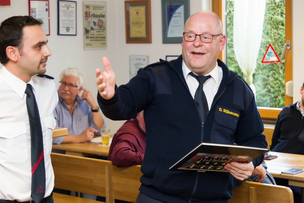 Zuletzt bedankte sich Bernhard Hahn ganz herzlich bei Dirk Rübesamen für seine Arbeit als Wehrführer. Als Zeichen der Wertschätzung und des Dankes wurden ihm von der Einsatzabteilung, der Alters- und Ehrenabteilung und vom Verein ein faltbarer Bollerwagen mit Utensilien für den sich ankündigenden Familienzuwachs, eine Flasche Wein mit feuerwehrtechnisch stilechtem Flaschenhalter sowie ein Buch mit vielen Fotos aus seiner Zeit als Feuerwehrmann in der Freiwilligen Feuerwehr Nieder-Erlenbach überreicht.