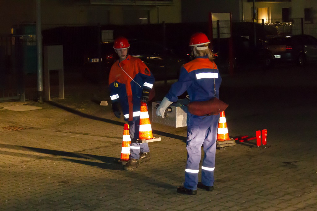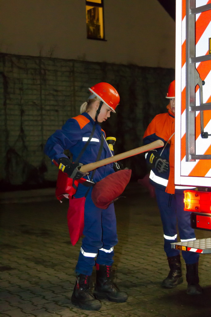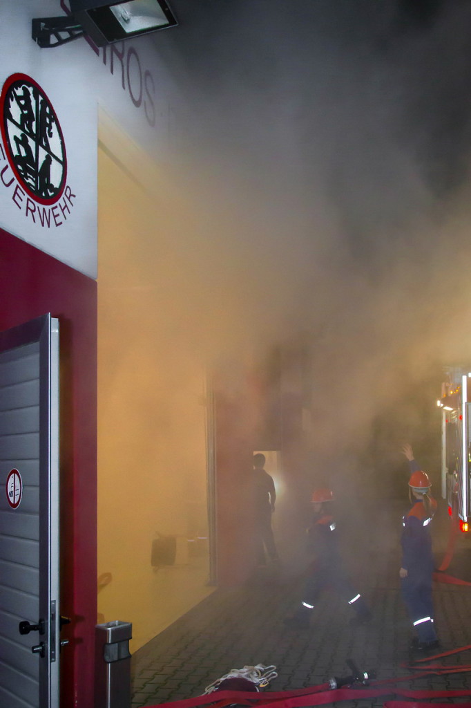 Wie bereits vorher vielfach geübt, baute unsere Jugendfeuerwehr einen Löschangriff auf. Parallel wurde das Löschgruppenfahrzeug gegen den fließenden Verkehr gesichert. Der Angriffstrupp musste sich auf der Suche nach Verletzten langsam vorarbeiten, die Sicht war durch Brandrauch stark beeinträchtigt (siehe Fotostrecke). Kurze Zeit später unterstützte der Wassertrupp beim Absuchen der Räumlichkeiten. Zwei Verletzte konnten gefunden und gerettet werden. Der Brand, der durch einen Kurzschluß im Mischpult des DJs ausgelöst wurde, konnte anschließend schnell gelöscht werden.