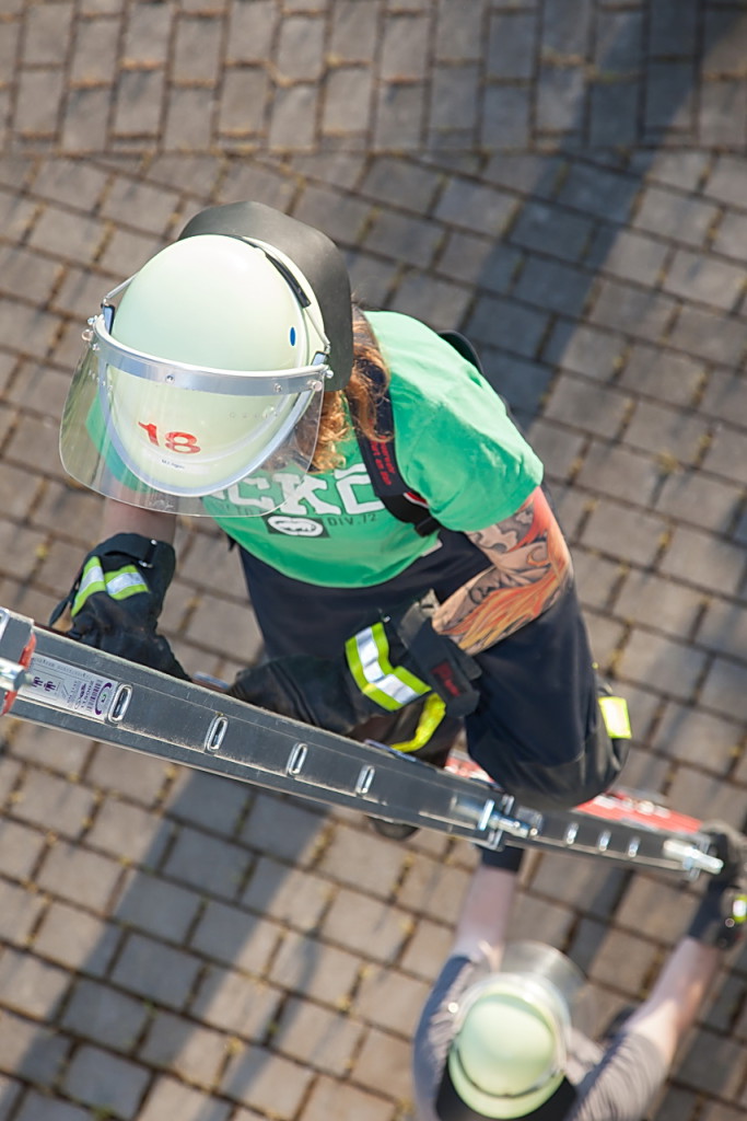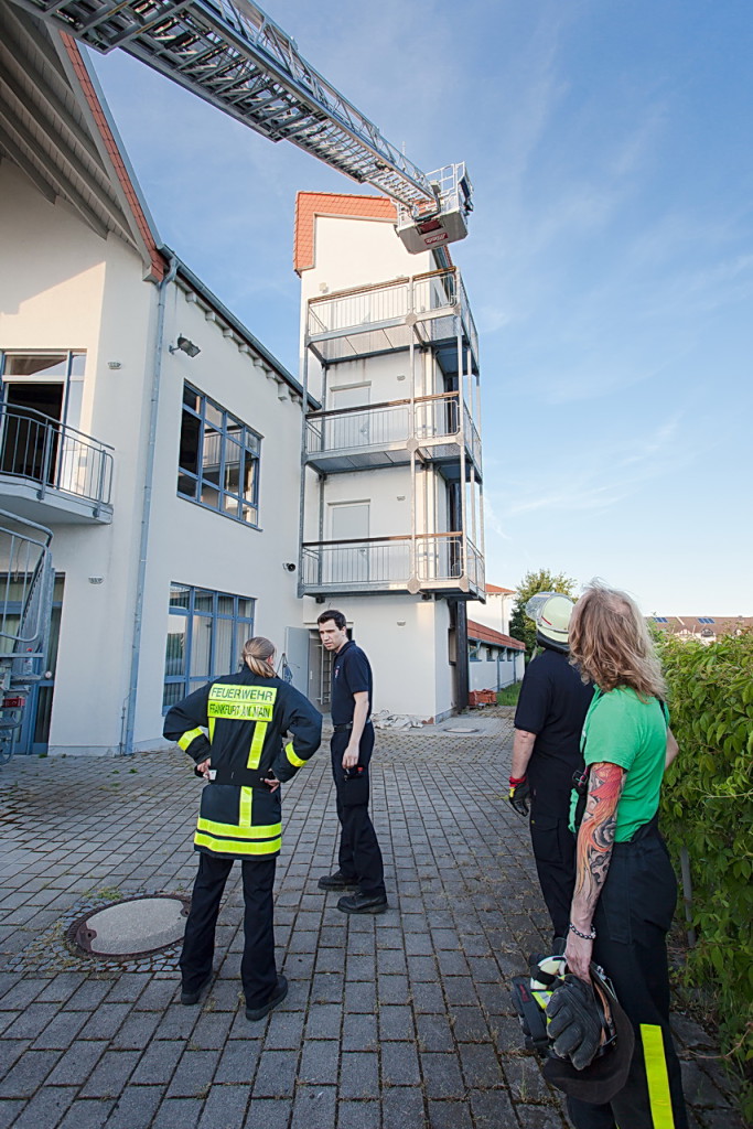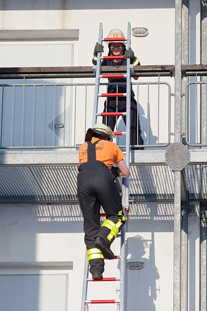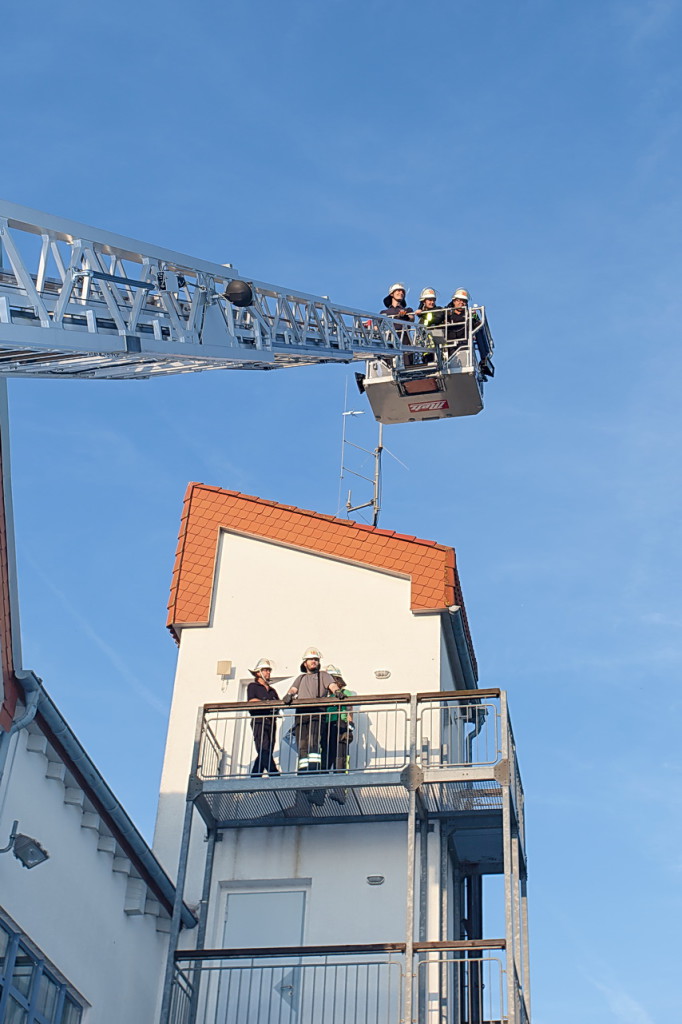 Nach der kurzen Fahrt nach Karben mit dem LF 10/6 wurden wir herzlich empfangen. Am Feuerwehrhaus der Freiwilligen Feuerwehr Karben-Mitte wurden dann die Übungen mit der vierteiligen Steckleiter und der dreiteiligen Schiebleiter durchgeführt. Der Schlauchturm der Karbener Feuerwehr bot uns hervorragende Möglichkeiten zum Anleitern. Nachdem das mehrmalige Stellen und Begehen der beiden Leitern mit wechselnden Aufgaben abgeschlossen war, konnten wir mit der Drehleiter der Karbener Feuerwehr üben.
