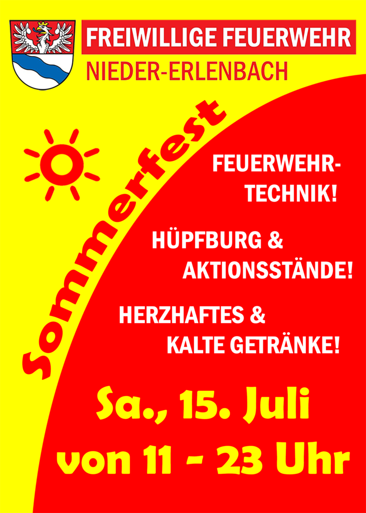 (gm) Am Samstag, 15.07.2023 startet das Sommerfest der Freiwilligen Feuerwehr Nieder-Erlenbach ab 11 Uhr bis 23 Uhr!