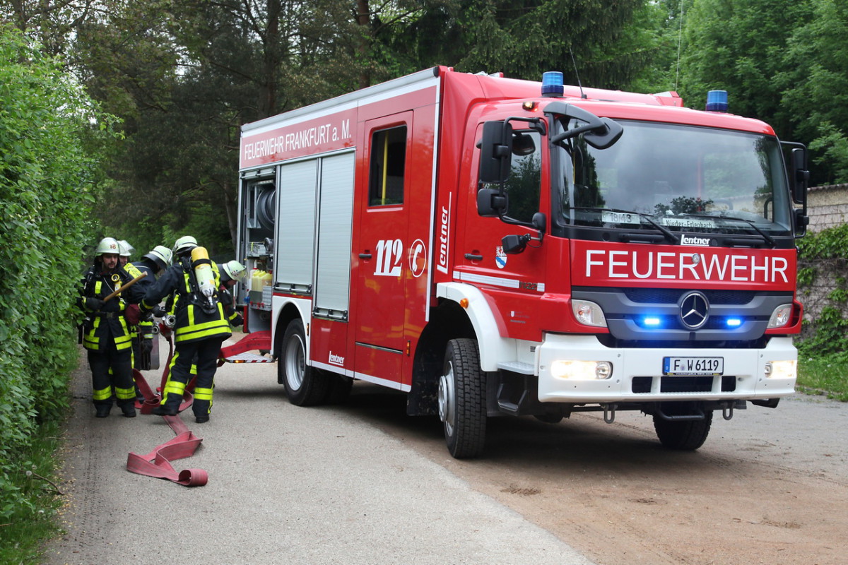 Spaziergänger und mitspazierende Hunde staunten nicht schlecht, als am vergangenen Donnerstagabend auf einmal heller Rauch aus dem Haus des Nieder-Erlenbacher Schützenvereins waberte. Einzig die Anwesenheit einiger Feuerwehrleute bevor es rauchte, war ein Hinweis darauf, dass es sich um eine Übung handelte. Kurze Zeit später rückte dann auch bereits die Nieder-Erlenbacher Feuerwehr mit den beiden Löschfahrzeugen an, und die Übung konnte beginnen.