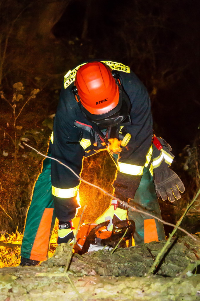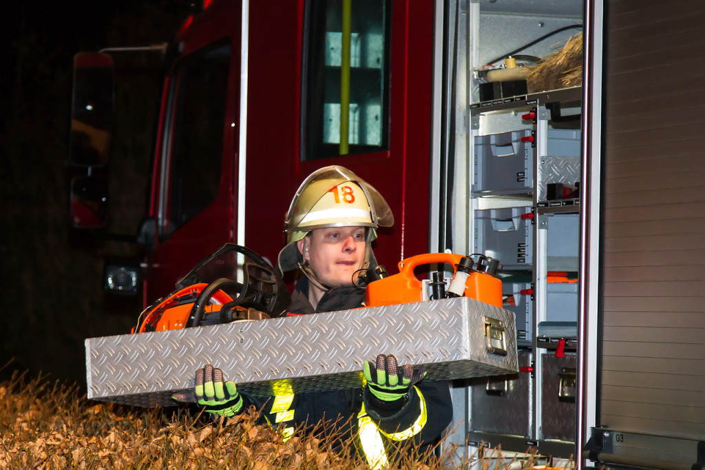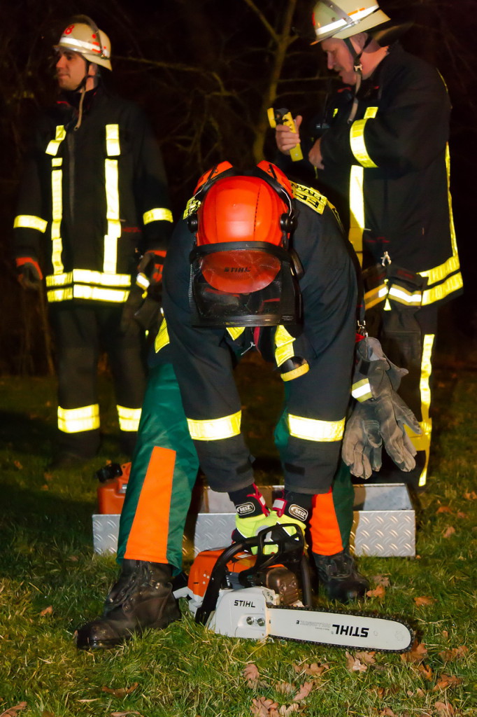 (gm) Bereits im Dezember war ein ursprünglich zwischen der Wiese des Schützenhauses und dem Erlenbach stehender Baum witterungsbedingt umgefallen. Für uns war das ein willkommener Anlass zu einer Übung, die das Ausleuchten einer Einsatzstelle mit unserem Geräteanhänger-Licht und den Einsatz der Kettensäge kombinierte.