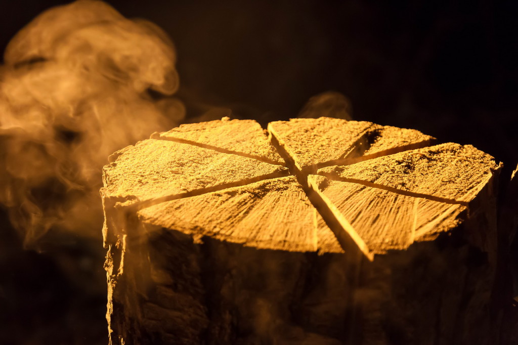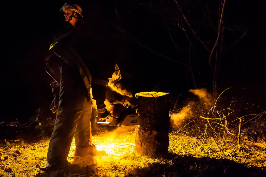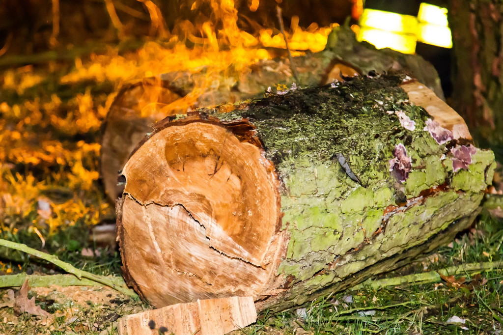 Anschließend konnte der Baum mit einer zur Beladung des Löschgruppenfahrzeugs zählenden Motorkettensäge in Stücke geschnitten werden, die durch die Kameraden entfernt wurden. Eine Baumscheibe aus dem unteren Bereich wurde am Ende der Übung noch durch vertikale Einschnitte zu einem Schwedenfeuer für spätere Verwendung aufgewertet.